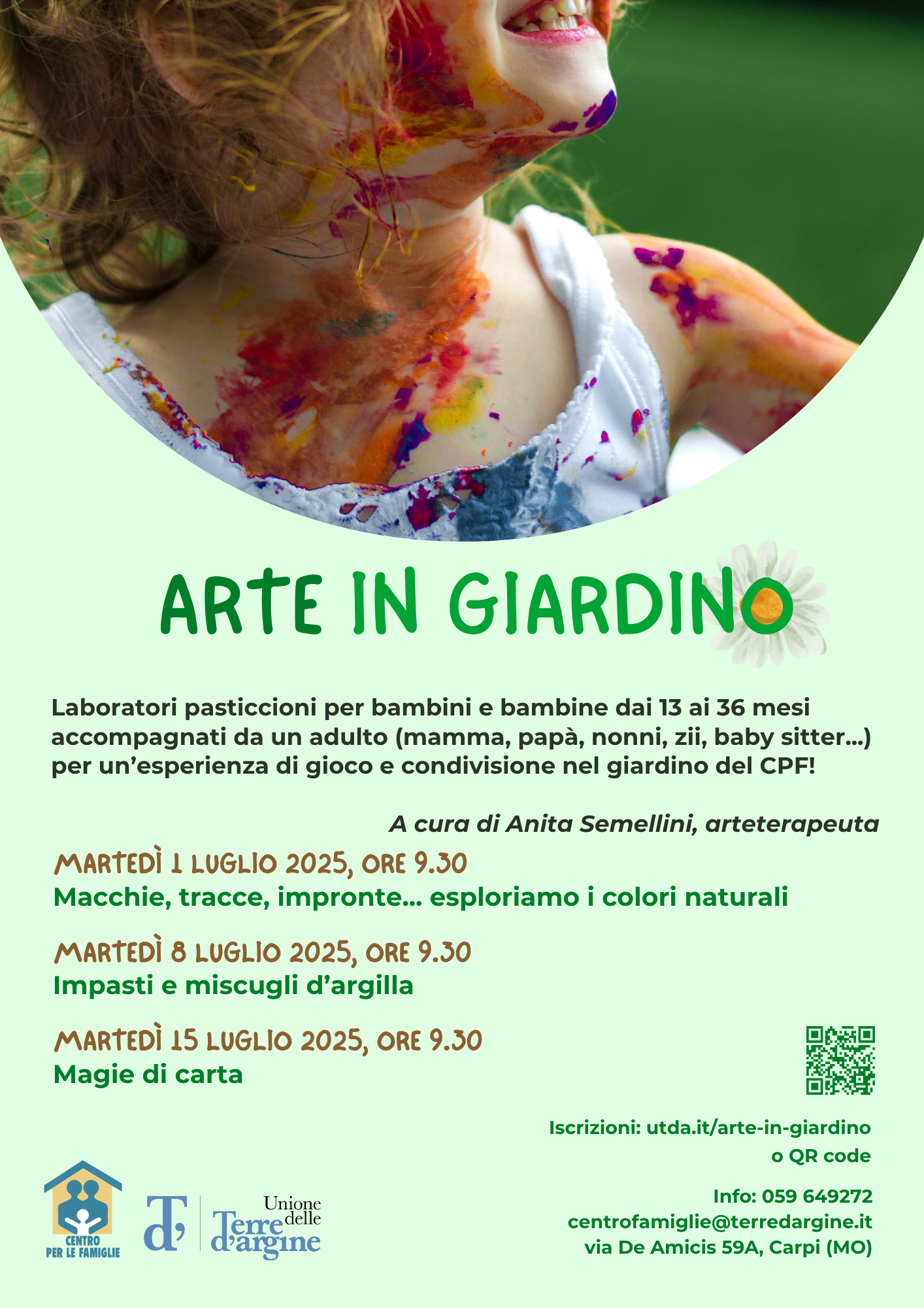 Laboratori pasticcioni per bambini e bambine dai 13 ai 36 mesi accompagnati da un adulto (mamma, papà, nonni, zii, baby sitter...). Martedì 1, 8 e 15 luglio, dalle 9.30 alle 11.30, presso il giardino del Centro per le Famiglie, a cura di Anita Semellini, arteterapeuta. Iscrizioni ad Arte in giardino