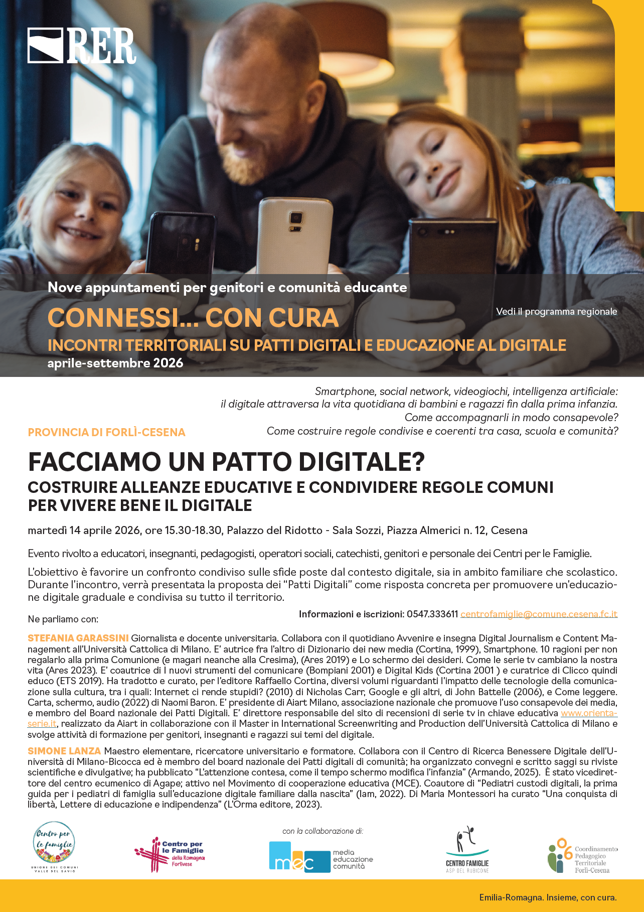 Come costruire regole condivise e coerenti tra casa, scuola e comunità? L’obiettivo è favorire un confronto condiviso sulle sfide poste dal contesto digitale, sia in ambito familiare che scolastico. Durante l’incontro, verrà presentata la proposta dei “Patti Digitali” come risposta concreta per promuovere un’educazione digitale graduale e condivisa su tutto il territorio. Info sul sito regionale.