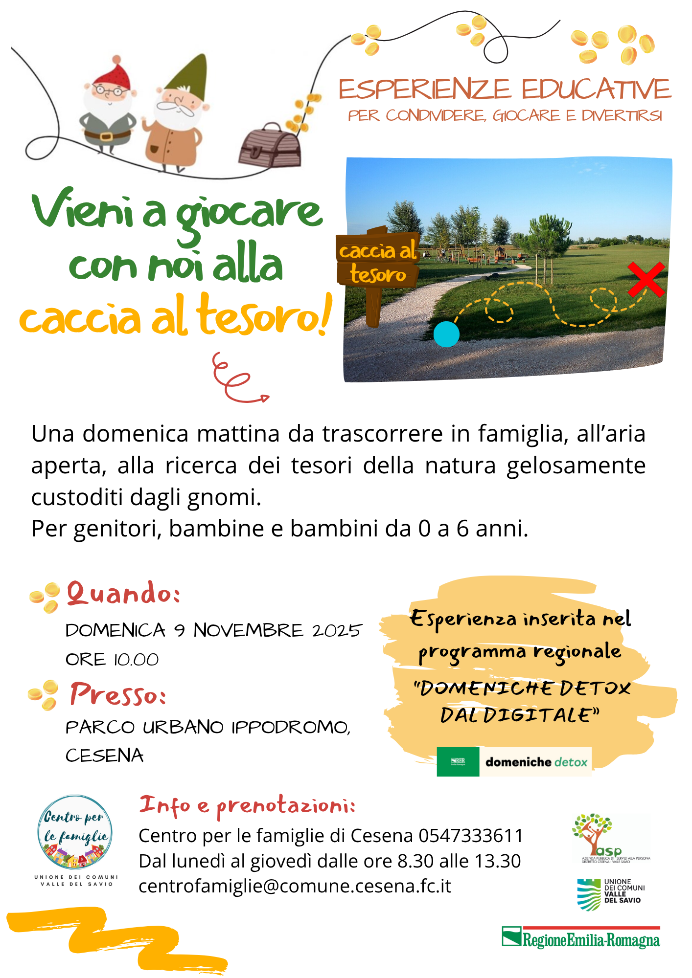 Il Centro per le famiglie vi invita ad alcune attività specifiche sul tema: la "Caccia al tesoro" (PNG - 1,1 MB) di domenica 9 novembre presso il parco Ippodromo a Cesena, dalle ore 10.00; e l'incontro per genitori "Sono qui! Mi leggi una storia?" (PNG - 637,9 KB) al Centro per le famiglie alle ore 10.00 per riflettere insieme alla Pediatra Dott.ssa Elisa Mariani.