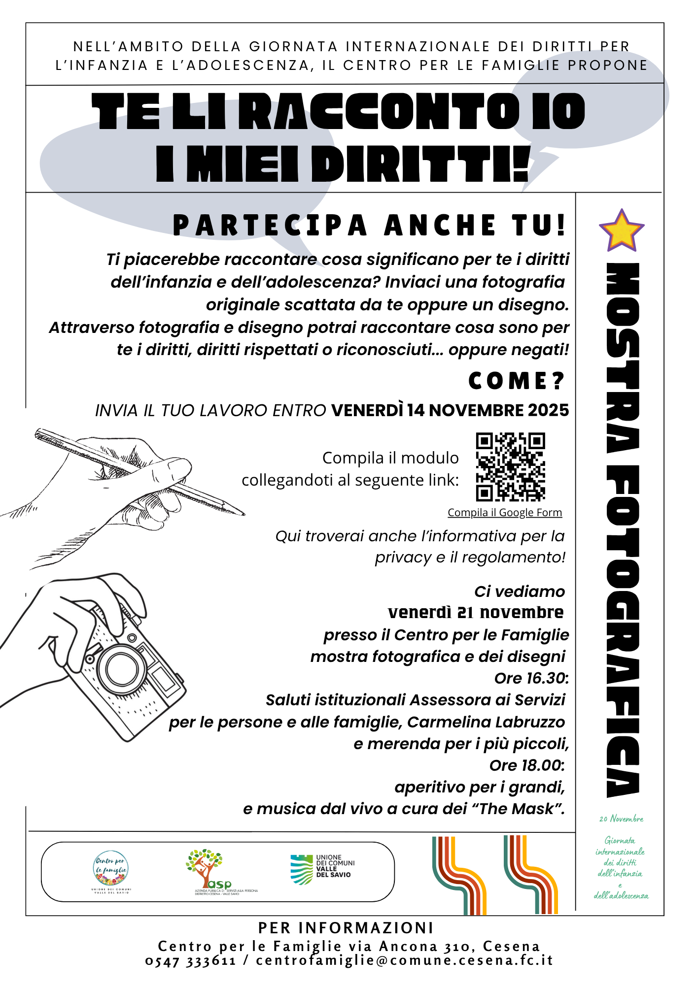 di seguito trovate tutte le iniziative del Centro per le Famiglie e alcune iniziative promosse da altri enti sul territorio. Novembre per noi è sempre un mese importante in cui ricordiamo la firma della Convenzione ONU sui Diritti dell'infanzia e dell'adolescenza. Vogliamo condividere con voi alcuni eventi per far riflettere tutti su questo importante tema. Trovate il calendario di seguito.