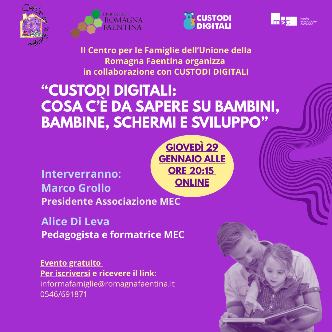 Conferenza online a cura di Custodi Digitali, interverranno: Marco Grollo (Presidente Associazione MEC) e Alice Di Leva (Pedagogista e formatrice MEC), Giovedì 29 gennaio alle ore 20.15. A seguire due proposte laboratoriali per genitori, bambine e bambini: martedì 10 febbraio alle ore 17 (6-10 anni) “Facciamo un patto digitale” e Lunedì 16 gennaio alle ore 17 (3-6 anni) “Dentro gli schermi c’è...”. Tutti gli incontri sono gratuiti ad iscrizione obbligatoria. Per informazioni e iscrizioni: informafamiglie@romagnafaentina.it 0546/691871 Whatsapp 3311364177