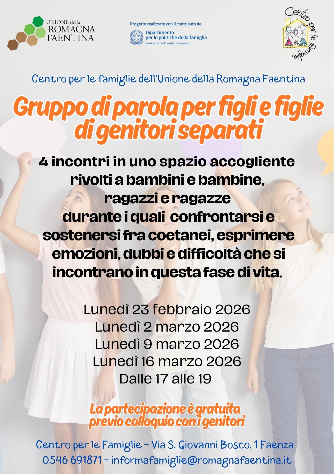 Partiranno a febbraio i Gruppi di parola per figli e figlie di genitori separati. Il gruppo di parola è un'esperienza di gruppo per bambini, bambine, ragazzi e ragazze che vivono la separazione o il divorzio dei genitori. Accompagnati da professionisti esperti potranno esprimere liberamente le proprie emozioni, dubbi e difficoltà che stanno vivendo. Si svolge in 4 incontri a cadenza settimanale dalle 17 alle 19. L’iscrizione è gratuita dopo un colloquio preliminare con i genitori. Iscrizione obbligatoria all'intero percorso. Per informazioni e iscrizioni: informafamiglie@romagnafaentina.it 0546/691871