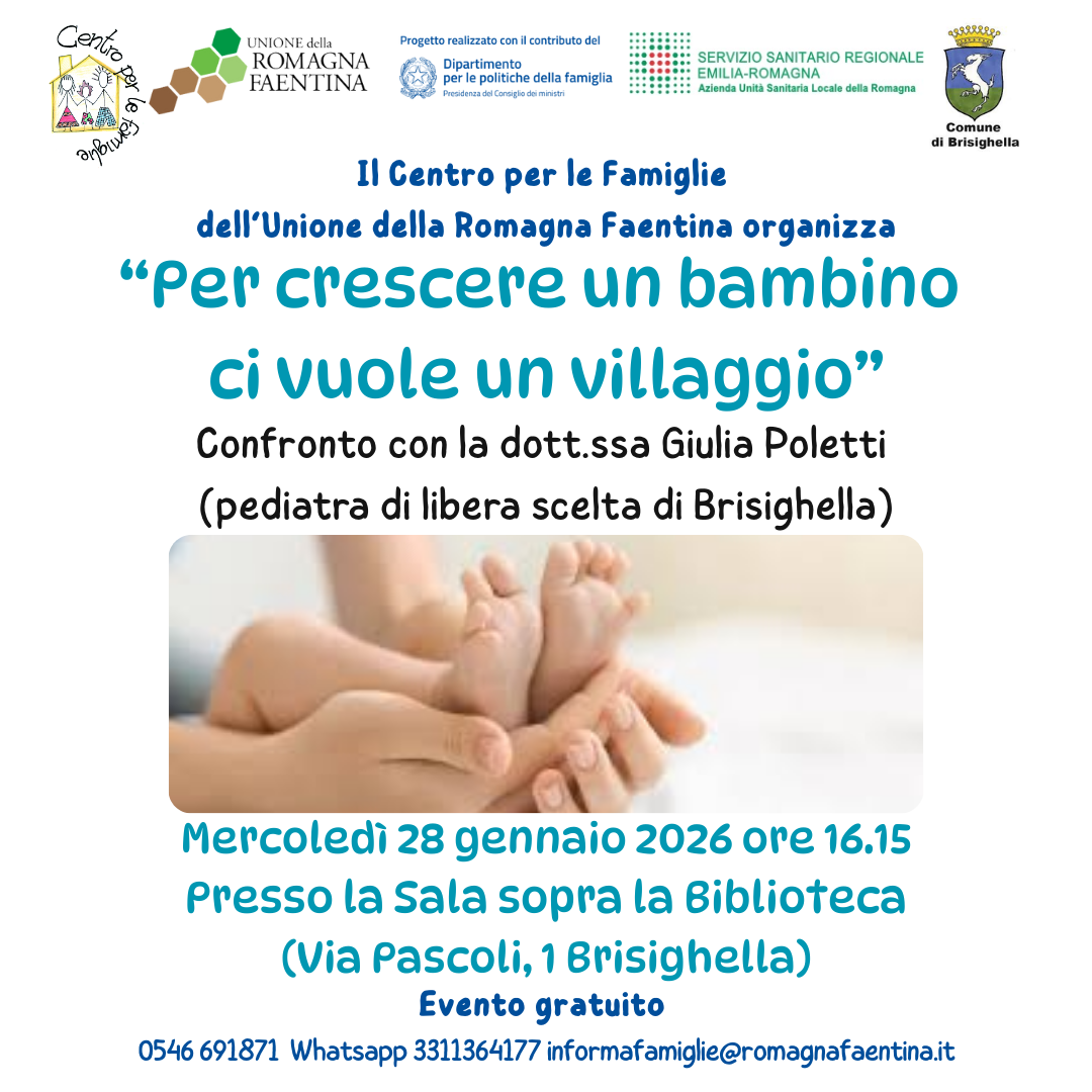 - Per crescere un bambino ci vuole un villaggio - Brisighella: Incontro e confronto con la pediatra di Brisighella, dott.ssa Giulia Poletti, Mercoledì 28 gennaio 2026 ore 16.15 presso la Sala sopra la Biblioteca (Via Pascoli, 1 Brisighella). Evento gratuito.