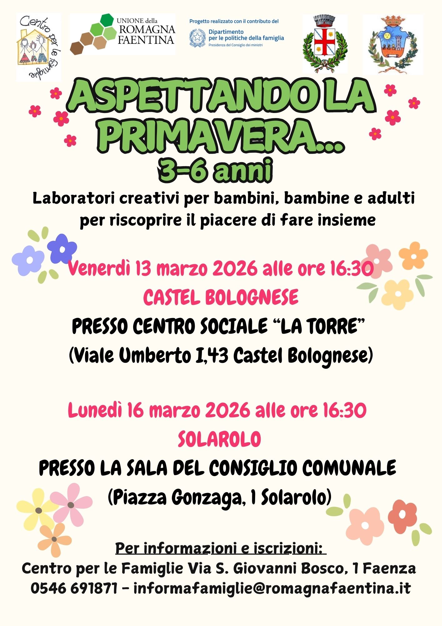 Laboratori creativi per adulti, bambini e bambine da 3 a 6 anni “Aspettando la Primavera” a cura delle operatrici del Centro per le famiglie. Prossimi appuntamenti: Venerdì 13 marzo alle ore 16.30 presso il Centro sociale La Torre (Viale Umberto I, 43 Castel Bolognese); Lunedì 16 marzo alle ore 16.30 presso la sala del Consiglio Comunale di Solarolo (Piazza Gonzaga, 1 Solarolo). I laboratori sono gratuiti ad iscrizione obbligatoria (a numero chiuso). Per informazioni e iscrizioni: informafamiglie@romagnafaentina.it 0546/691871