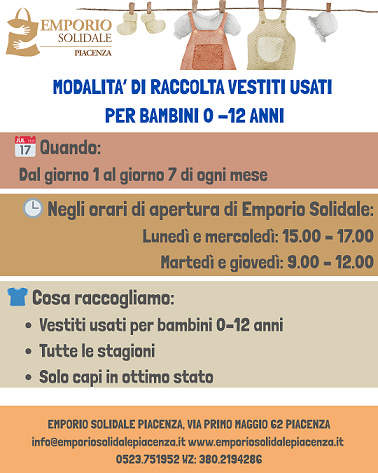 Dal giorno 1 al giorno 7 di ogni mese si raccolgono vestiti usati in ottimo stato, adatti a bambini da 0 a 12 anni.