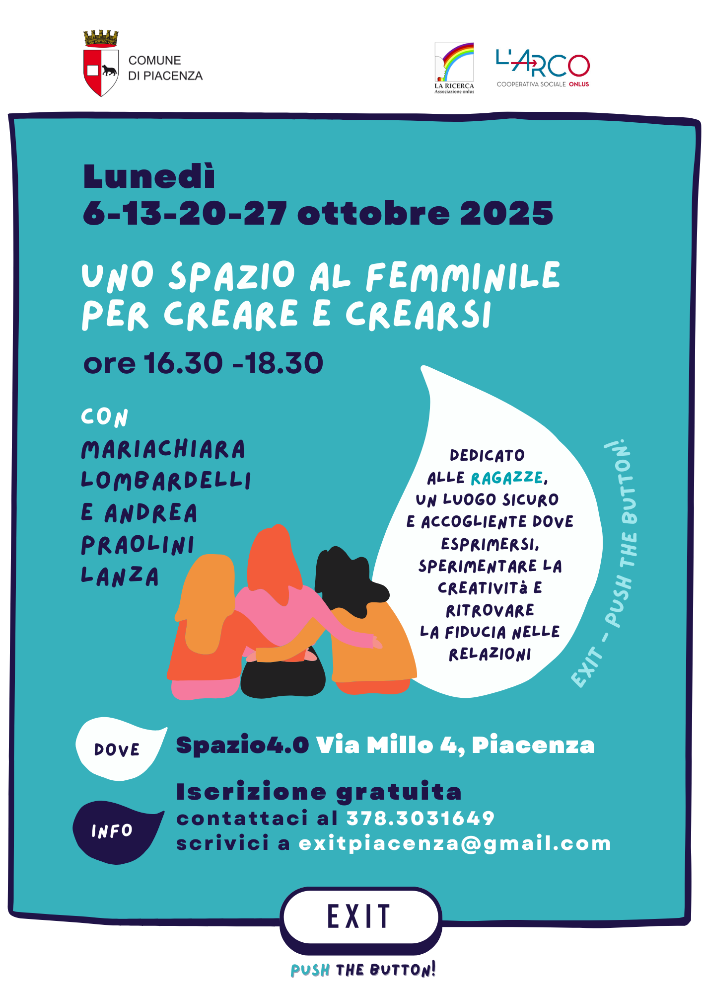 EXIT è un progetto del Comune di Piacenza che si pone come obiettivo quello di contrastare il fenomeno del ritiro sociale dei giovani del Comune di Piacenza, a cura dell' Associazione La Ricerca e in collaborazione con la Cooperativa sociale L’Arco. Il progetto intende coinvolgere e sensibilizzare la comunità e strutturare attività specifiche - integrate con la rete dei servizi - per ragazze e ragazzi a rischio o già in situazione di ritiro sociale e le loro famiglie.