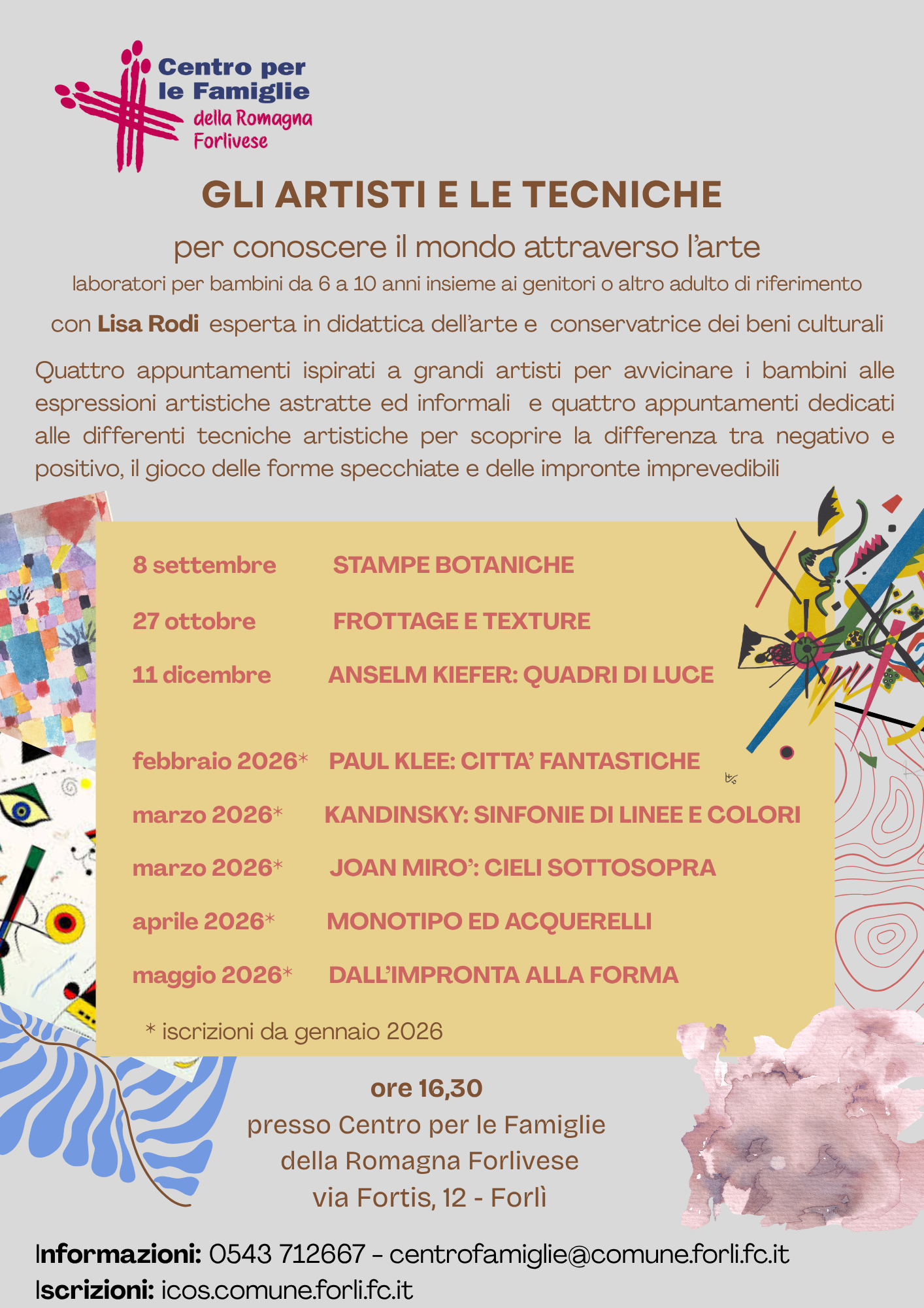 - "Gli artisti e le tecniche (PNG - 986,6 KB)", laboratori per genitori e bambini 6/10 anni, all'interno de "I Labooratori del Lunedì (PDF - 5,6 MB)", per genitori e bambini 3/10 anni, a Forlì.