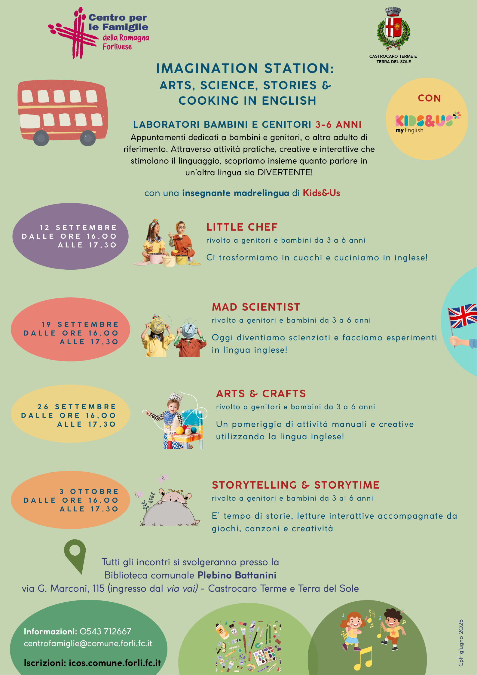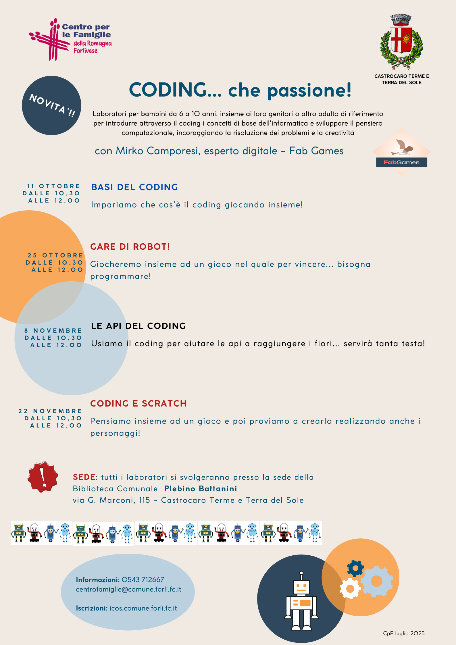 - "Imagination station: arts, science, stories & cooking in english (PNG - 623,7 KB)", laboratori per genitori e bambini 3/6 anni e "Coding... che passione! (PNG - 522,1 KB)", per genitori e bambini 6/10 anni, a Castrocaro Terme e Terra del Sole.