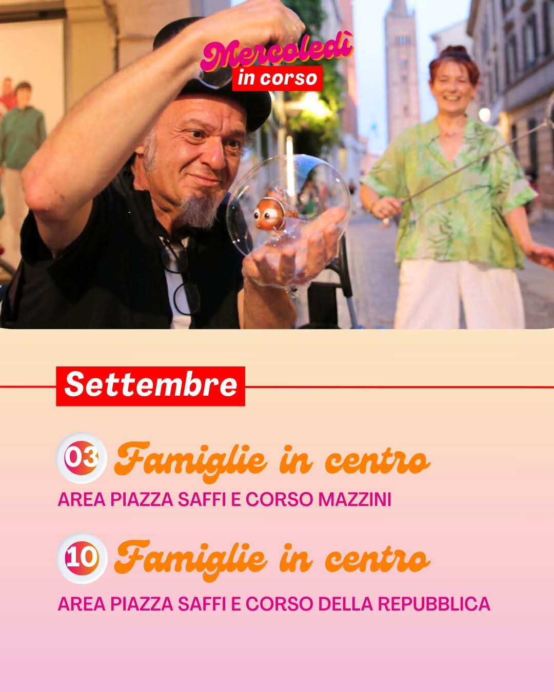 Mercoledì 3 e 10 settembre -"Famiglie in centro (JPEG - 100,8 KB)", area Piazza Saffi, C.so Mazzini e C.so della Repubblica, per riscoprire il piacere di stare insieme, all'aperto. In particolare evidenziamo il 10 settembre - dalle 19.30 alle 21.30 - "Mercoledì delle Famiglie," letture insieme ai Volontari di Nati per Leggere e Nati per la Musica, c/o Farmacia comunale Calboli, P.le De Calboli 1. Maggiori info.