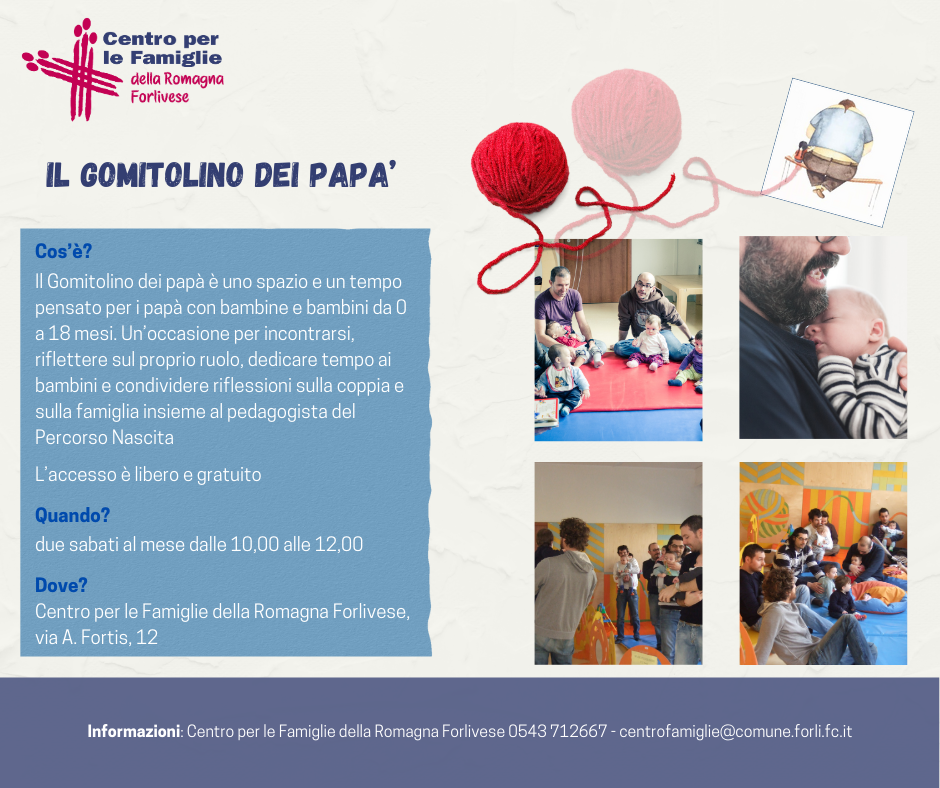 - Sabato 4, 18 ottobre, 8, 22 novembre e 13, 20 dicembre - dalle 10.00 alle 12.00 - spazio incontro "Il Gomitolino dei papà (PNG - 750,0 KB)". Nella data del 13 dicembre sono invitate a partecipare anche le mamme! Accesso libero.