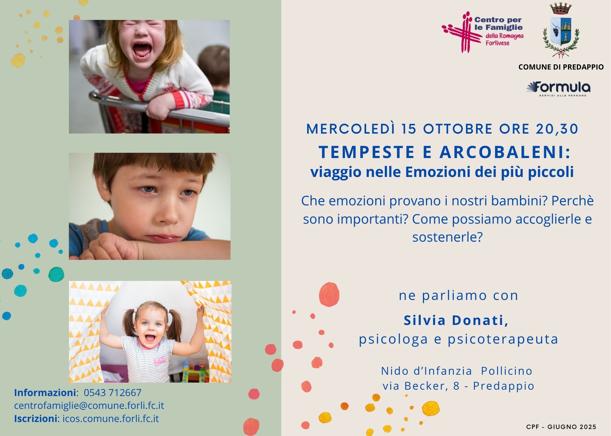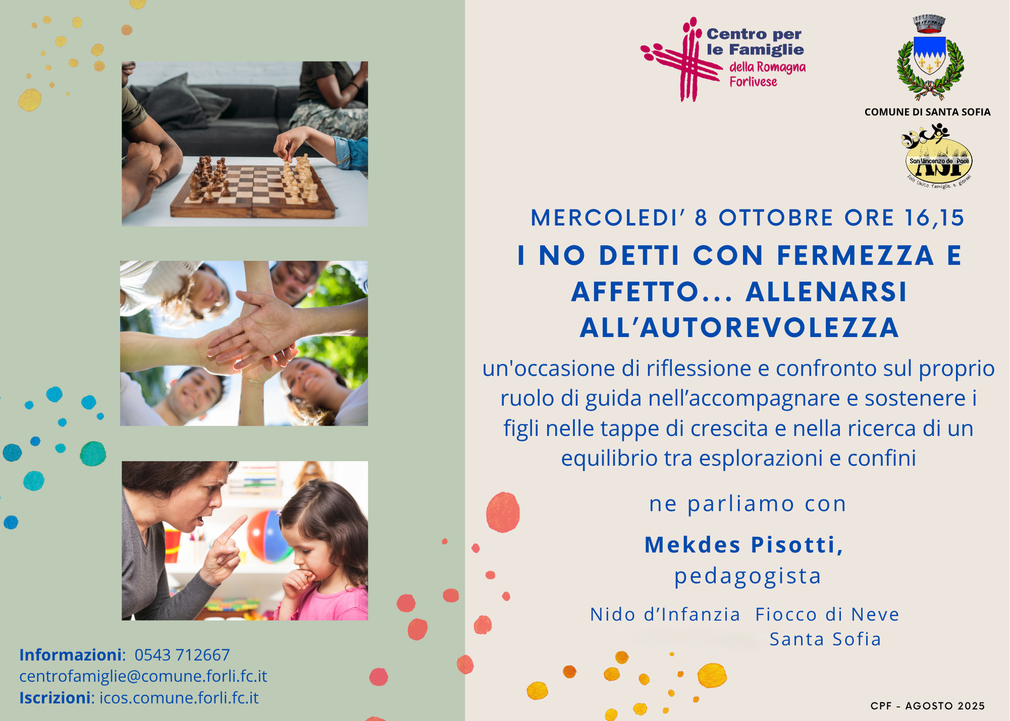 - Incontri per genitori di bambini 0/6 anni nel territorio: "I no detti con fermezza e affetto... Allenarsi all'autorevolezza" (PNG - 1,6 MB), a Santa Sofia e "Tempeste e arcobaleni: viaggio nelle emozioni dei più piccoli (JPEG - 256,3 KB)", a Predappio.