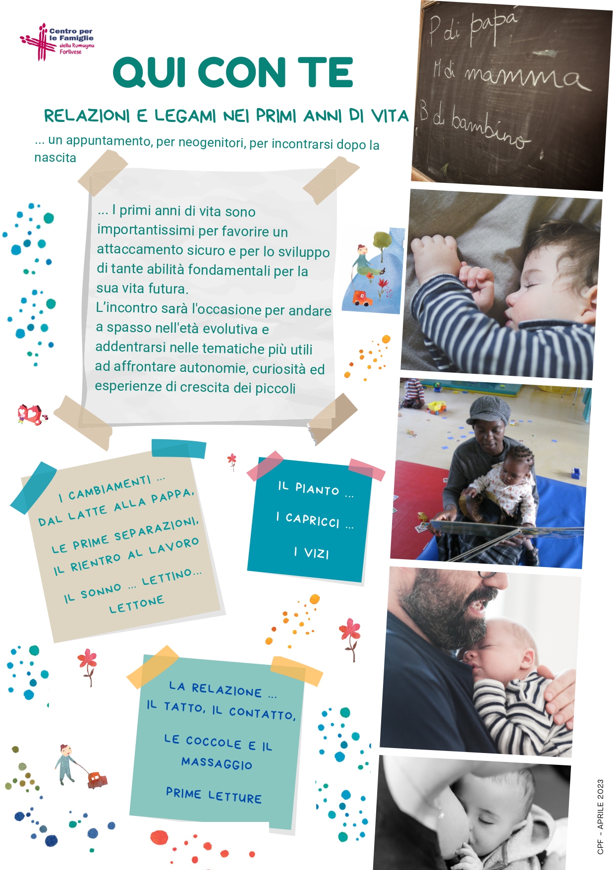 - "Qui con te - Relazioni e legami nei primi anni di vita (JPEG - 993,8 KB)", un incontro per neogenitori, dopo la nascita. Servizio su invito o su richiesta di partecipazione.
