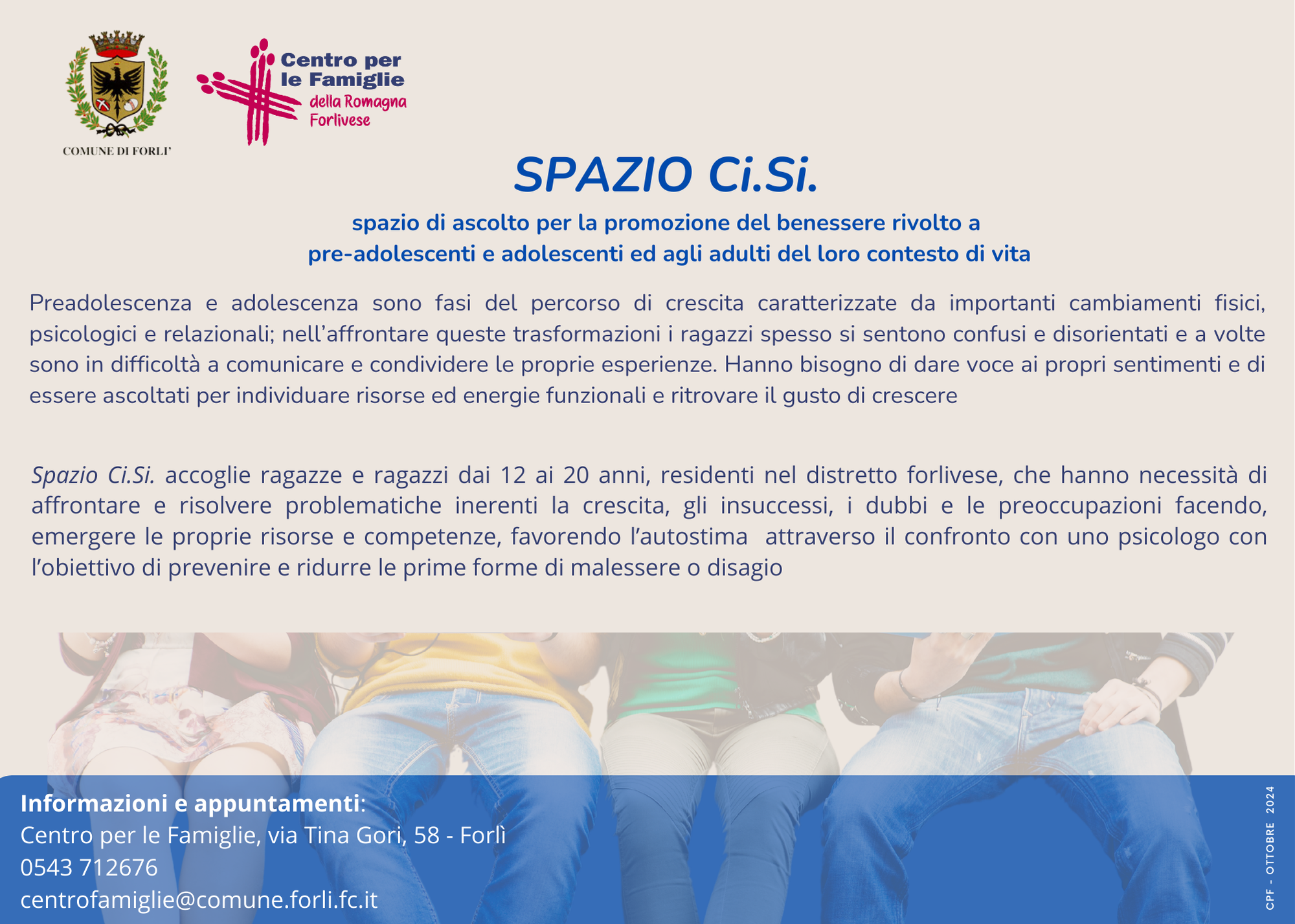 > "Spazio CiSi (PNG - 1,7 MB)" è uno sportello di ascolto per la promozione del benessere rivolto a preadolescenti, adolescenti (età 12/20 anni) e adulti del loro contesto di vita, residenti nel Comprensorio forlivese. E' uno spazio e un tempo che accoglie le "normali difficoltà" del crescere, i dubbi, le incertezze e le ansie che connotano la vita quotidiana. Servizio gratuito su appuntamento. Sede: Centro per le Famiglie, V. Tina Gori 58;