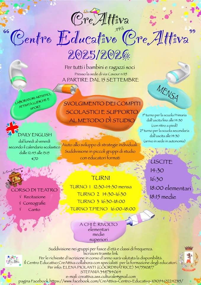 Sede: Centro Educativo CreAttiva, V. Cavour 115. Info: Elena (3475310877) e Stefania (3487314064) - creattiva.ass.culturale@gmail.com. Maggiori info.