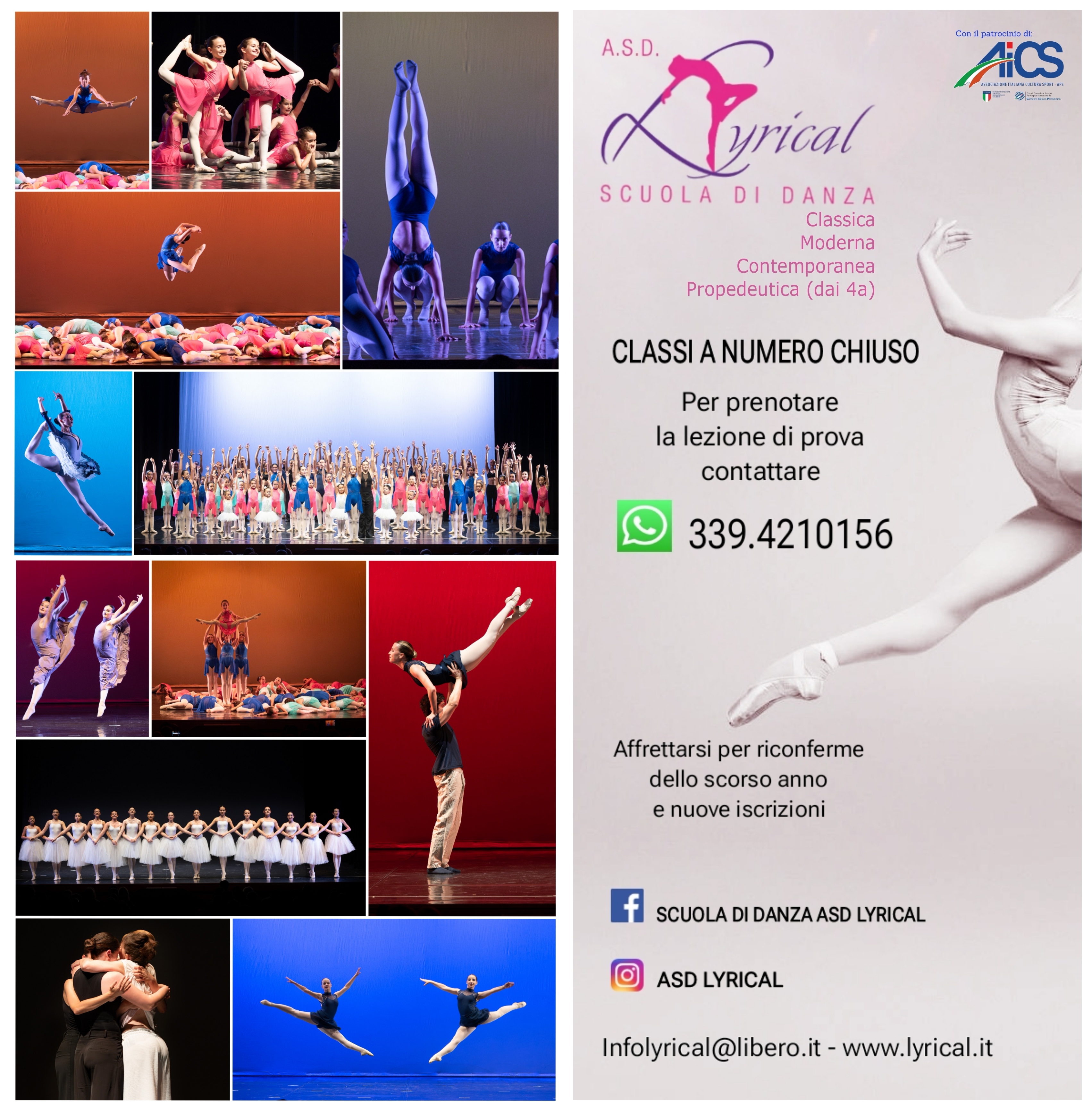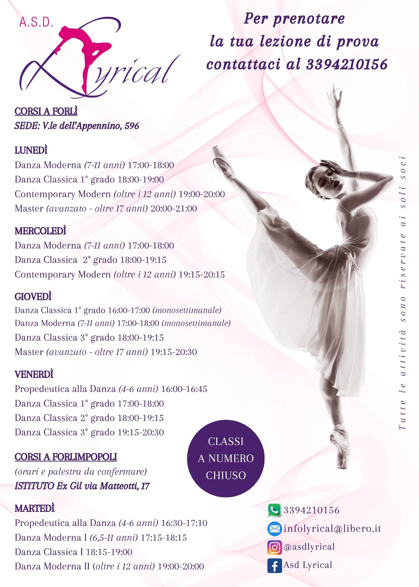 Sedi: V.le dell'Appennino 596 - Forlì e Ex-Gil, V.le Matteotti 17 - Forlimpopoli. Info e iscrizioni: 3394210156 - infolyrical@libero.it - FB - IG.
