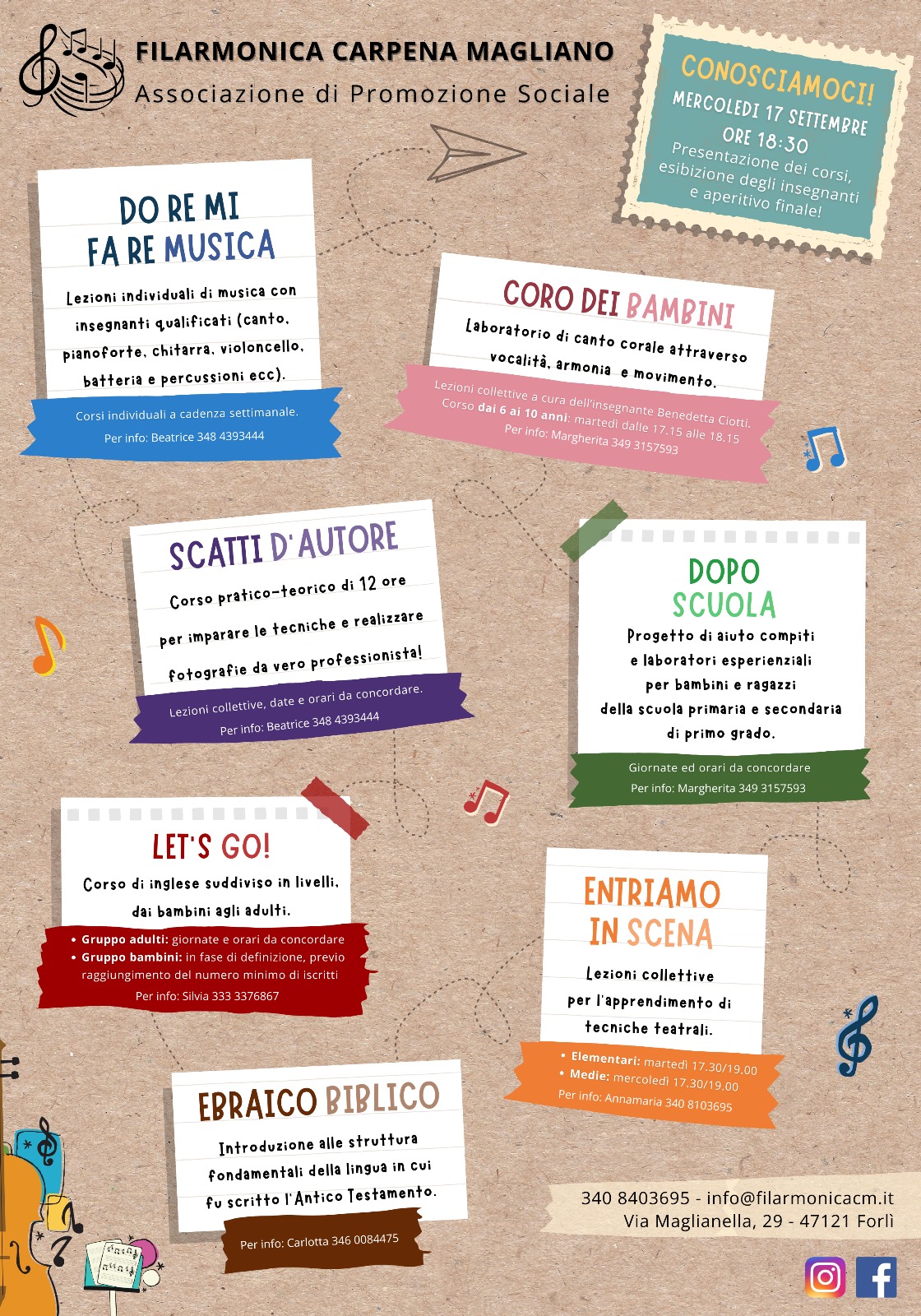 Sede: Via Maglianella 29 - 47121. Info e iscrizioni: 3408403695 - info@filarmonicacm.it. Maggiori info (Word - 59,5 KB) - FB - IG - www.filarmonicacm.it.