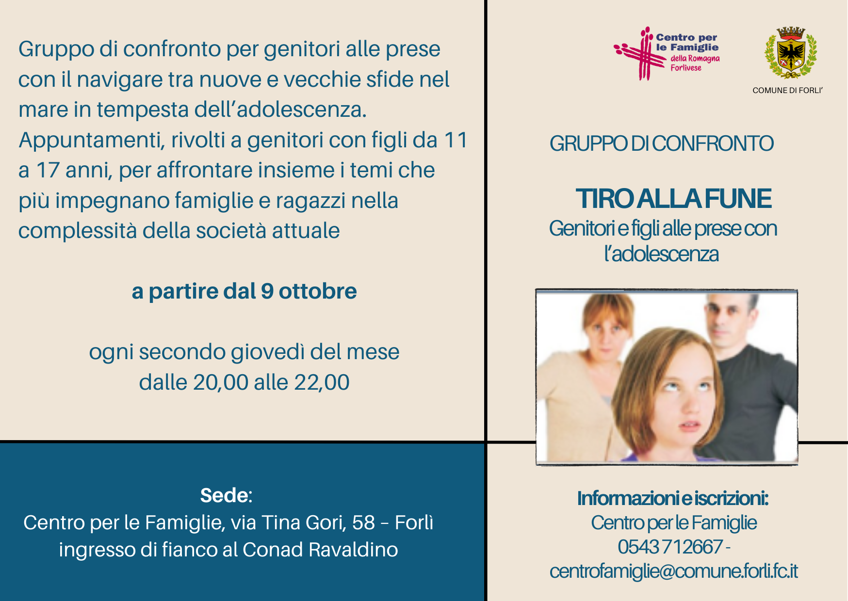 > ogni secondo giovedì del mese, dal 9 ottobre - dalle 20.00 alle 22.00 - "Tiro alla fune (PNG - 548,0 KB)", gruppo di confronto per genitori di adolescenti e preadolescenti. Sede: Centro per le Famiglie, V. Tina Gori 58.