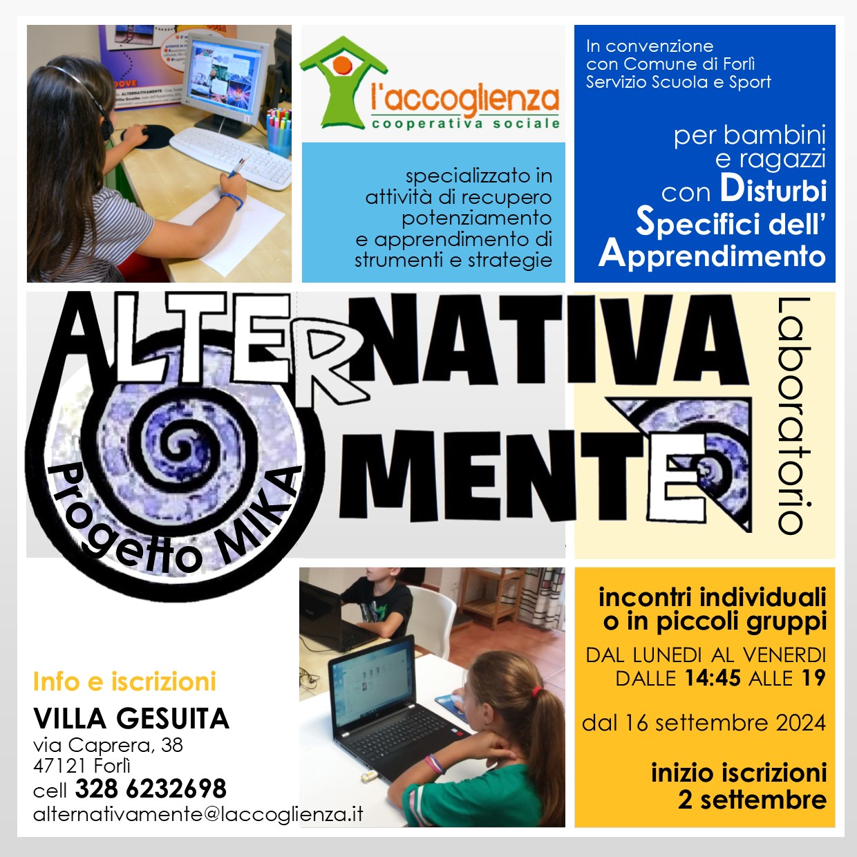 - "Alternativamente laboratorio DSA (JPEG - 349,7 KB)", per ragazzi fino a 18 anni, con Disturbi Specifici dell’Apprendimento (DSA - dislessia, disgrafia, disortografia, discalculia) durante l’anno scolastico, dal lunedì al venerdì - dalle 14.45 alle 19.00: favorisce il loro percorso scolastico, promuove la loro autonomia e la loro integrazione ed è gestito da personale specializzato sui DSA e su specifiche strategie educative, volte all’acquisizione efficace dei contenuti scolastici e allo svolgimento dei compiti pomeridiani. Ogni studente ha la possibilità di strutturare il proprio momento compiti grazie all’utilizzo di metodologie didattiche specifiche e individualizzate e all’utilizzo di misure compensative, selezionate sulla base delle reali difficoltà e necessità: Start ( per studenti di scuole medie), Up (per studenti del biennio della scuola superiore) e Go ( per studenti del triennio della scuola superiore). Maggiori info (JPEG - 398,1 KB). Sede: V. Caprera 38. Info e iscrizioni: 3286232698 - alternativamente@laccoglienza.it - FB;