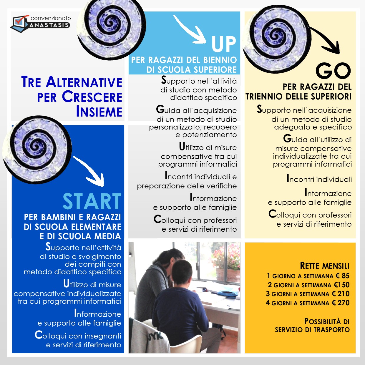 - "A-prendere il mondo", per ragazzi fino a 18 anni, con difficoltà e/o disturbi dell’apprendimento: centro di accompagnamento allo studio, per la costruzione di un metodo di studio personalizzato, l'acquisizione di strategie specifiche e l'utilizzo di strumenti compensativi e informatici, con l’obiettivo di recuperare il piacere del pensare.
