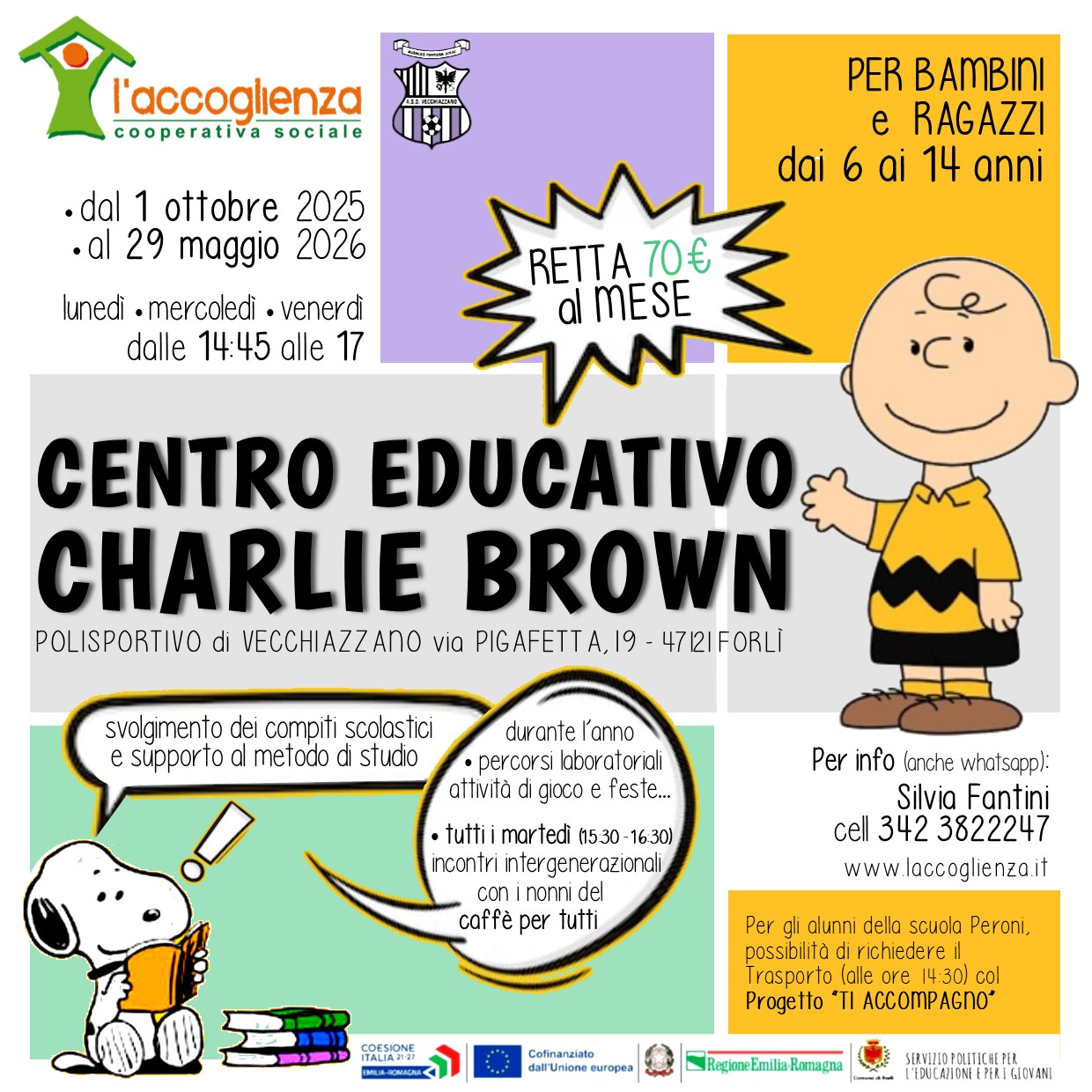 - "Centro educativo pomeridiano Charlie Brown (JPEG - 332,1 KB)", per ragazzi fino a 14 anni, dal lunedì al venerdì - dalle 14.45 alle 17.00. Il martedì - dalle 15.30 alle 16.30, offre attività intergenerazionali. Sede: Polisportivo Treossi a Vecchiazzano, V. Pigafetta 19. Info e iscrizioni: 342 3822247 - vecchiazzano@laccoglienza.it - IG;