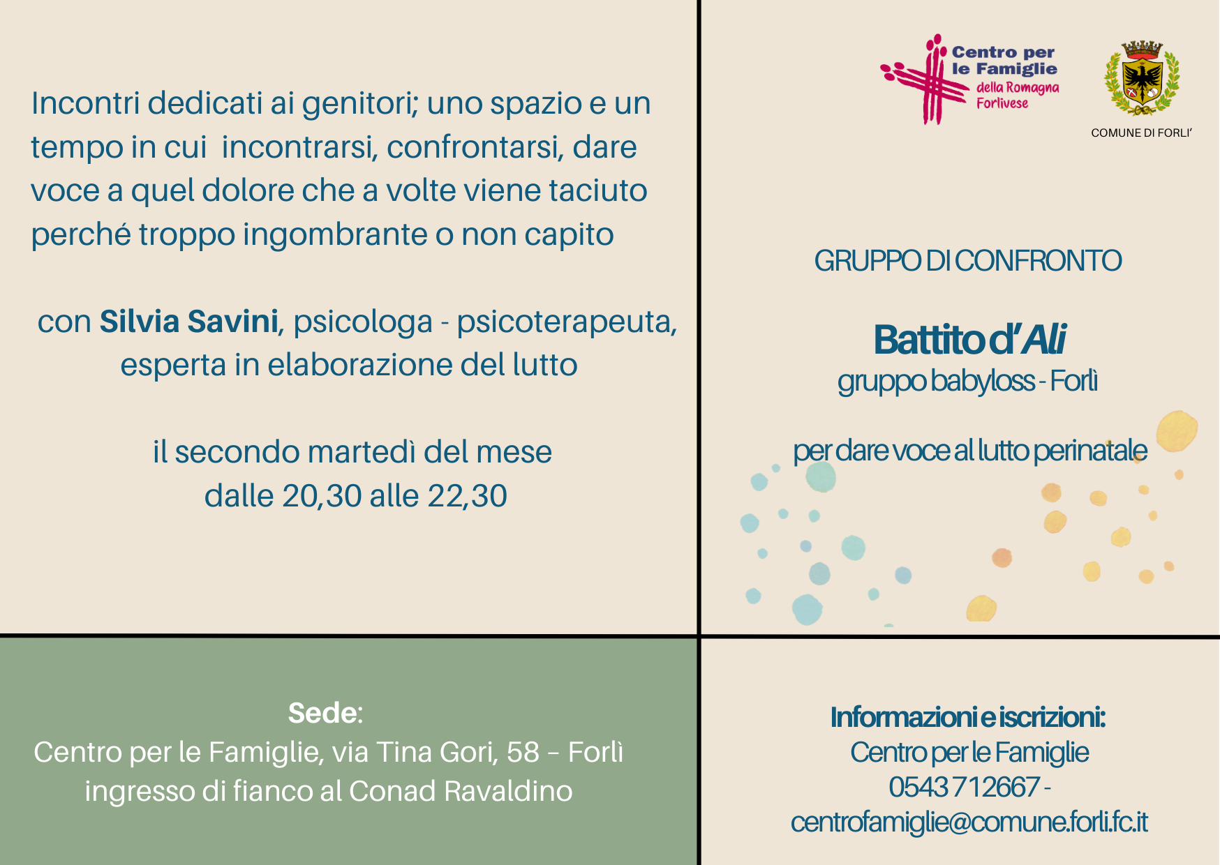 - Il secondo martedì del mese (il prossimo sarà il 9 settembre) - dalle 20.30 alle 22.30 - "Battito d’Ali, gruppo babyloss Forlì - per dare voce al lutto perinatale (PNG - 254,9 KB)";
