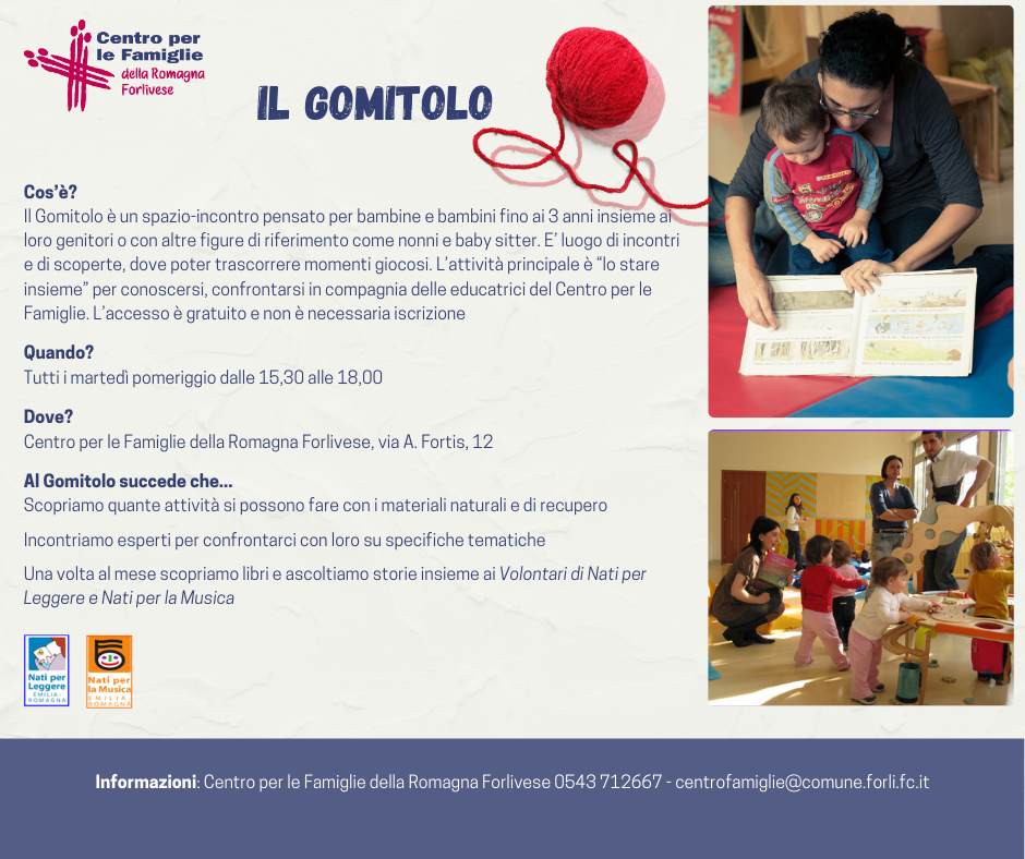 Sedi del Centro per le Famiglie: V. Tina Gori 58 e V. A. Fortis 12. Info e iscrizioni: V. Tina Gori 58 - 0543 712667 - centrofamiglie@comune.forli.fc.it oppure su icos.comune.forli.fc.it.