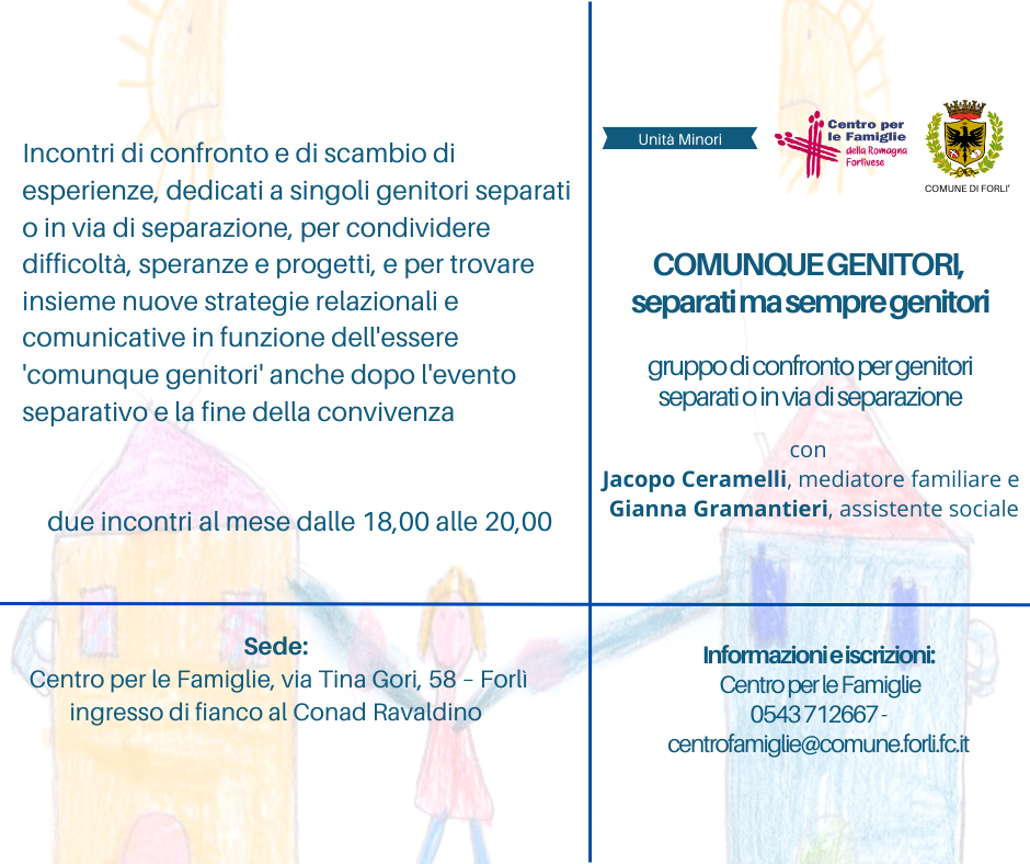 - giovedì 19 giugno - dalle 18.00 alle 20.00 - "Comunque genitori; separati ma sempre genitori (PNG - 470,5 KB)", per genitori separati o in via di separazione.