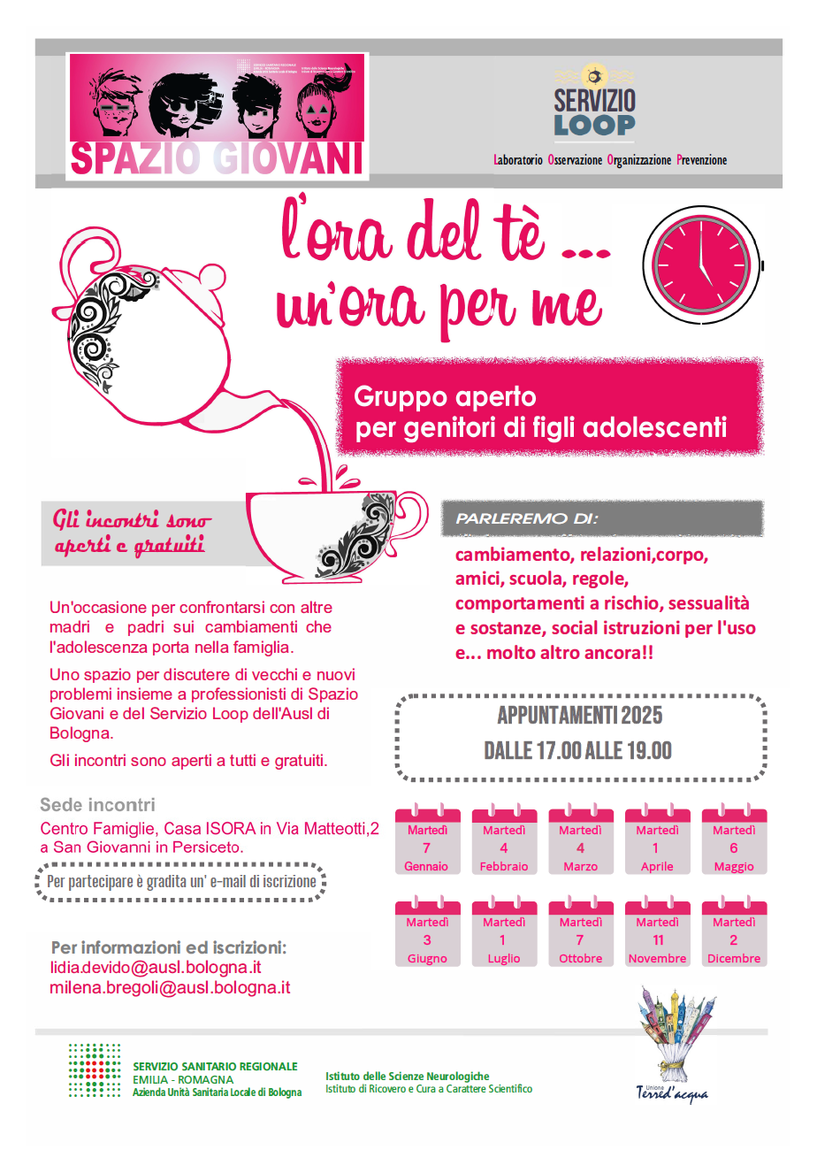 Incontri mensili aperti e gratuiti rivolti ai genitori per confrontarsi con altre madri e padri sui cambiamenti che l'adolescenza porta nella famiglia, con la presenza di professionisti dello Spazio Giovani del Consultorio Familiare e del Servizio LOOP dell'Ausl di Bologna. Si parla di cambiamenti, relazioni, corpo, amici, scuola, regole, comportamenti a rischio, sessualità, sostanze, uso dei social e molto altro.